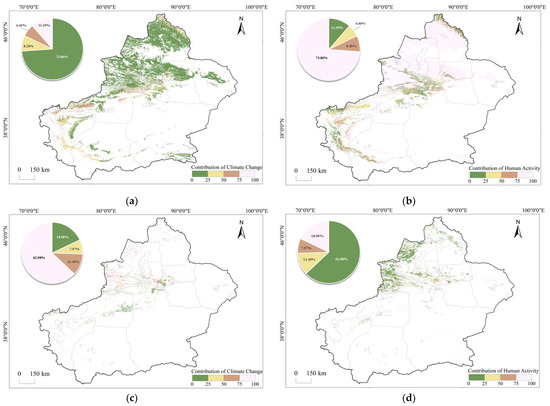 Spatial distribution and change trend of NPP driven by climate change and human activities in Xinjiang from 2001 to 2022. (a) The spatial distribution of NPP driven by climate change; (b) the spatial distribution of NPP driven by human activities; (c) the trend of NPP changes driven by climate change; (d) the trend of NPP changes driven by human activities.
