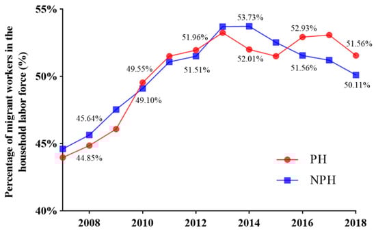 The release of the labor force has contributed to outwork for both PHs and NPHs, but this increase has been greater for PHs. In 2007, the percentage of migrant workers in PHs and NPHs accounted for 43.97% and 44.60% of the household labor forces, respectively (Figure 2). Subsequently, the percentage of migrant workers in the household labor force increased for both PHs and NPHs, and that of PHs has been higher than that of NPHs since 2016. In 2018, the percentage of migrant workers in PHs and NPHs accounted for 51.56% and 50.11% of the household labor force, respectively.