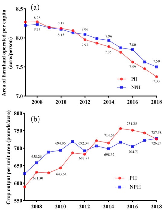 Area of farmland operated per capita by PHs and NPHs; (a) crop output per unit area for PHs and NPHs (b).