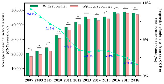 Average annual household income of PHs with and without GGP subsidies (Bar chart) and the proportion of the GGP subsidies to total household income (Line chart) (note: * p < 0.05, ** p < 0.01; ns indicates no significance).