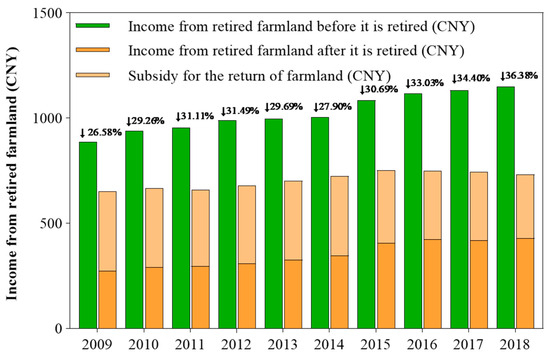 The income from retired farmland after retiring is lower than that before retiring, and the retired farmland subsidies do not make up for the losses incurred by farming households as a result of retiring their farmland. In addition to planting ecological forests on retired farmland to reduce soil erosion and wind and sand disasters, the GGP also increases the income of households by compensating them for planting economic forests (e.g., mountain apricots, lemons, chestnuts). Although the income from retired farmland is increasing, it is still low, and it remains less than that generated by the farmland before it is retired. The subsidies from retired farmland can reduce farmers’ losses to some extent, but even with the addition of the subsidies, the total income after the farmland is retired is lower than the income before it is retired. Compared with farmland before it was retired, the income of the retired farmland subsidies and the income from retired farmland decreased by 26.58% to 36.38%; this was especially the case in 2018, when the income of the retired farmland declined the most (Figure 5). Thus, the current economic benefits of retired farmland are too low to be a viable alternative source of income for most households.