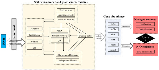 The riparian–river interface (RRI) is the waterfront region of the riparian zone, serving as a transitional zone between aquatic and terrestrial ecosystems, facilitating frequent exchange and transformation of matter and energy. Therefore, the RRI is the primary area where the riparian zone exerts its ecological functions, playing a crucial role in the ecological restoration of water bodies and in reducing greenhouse gases in urban waterfront areas [1]. Nitrogen, one of the major pollutants causing eutrophication in water bodies, can be significantly reduced through denitrification processes at the RRI. Riparian zones contribute to nitrogen removal by intercepting, adsorbing, storing, and facilitating nitrification and denitrification processes [2,3,4]. Globally, riparian zones can remove approximately 67.5% of nitrogen entering water bodies through surface runoff [5]. Among these processes, nitrification and denitrification are crucial for converting nitrogen pollutants in riparian ecosystems into gaseous forms, representing key mechanisms for eliminating nitrogen pollutants from riparian ecosystems. In an aerobic environment, nitrification is the progressive transformation of ammonium nitrogen into nitrate nitrogen (NO3−) or nitrite nitrogen (NO2−). The nitrification process, which is powered by ammonia-oxidizing archaea (AOA) and ammonia-oxidizing bacteria (AOB), begins with ammonia oxidation, which is the key rate-limiting phase [6]. In an anaerobic environment, the denitrification process gradually converts soluble nitrate or nitrite nitrogen to gaseous nitrogen [7]. However, during the nitrification and denitrification processes, nitrogen can be transformed into nitrogen gas (N2) as well as nitrous oxide (N2O) [8,9]. Nitrous oxide is a persistent greenhouse gas, and despite its lower atmospheric concentration, it has a warming potential 298 times that of CO2 [10,11]. Although direct research data on N2O emissions at the RRI of urban riparian zones are lacking, studies on similar wetland ecosystems suggest that, despite wetlands covering only 5% of the total global land area, they contribute to 20% of the current global N2O emissions. As riparian zones are a type of wetland ecosystem characterized by high soil organic matter content, shallow groundwater levels, and frequent aerobic–anaerobic transitions, their N2O emissions are of significant concern. Therefore, while the water–land interface of urban riparian zones plays a role in removing nitrogen pollutants from water bodies and restoring aquatic ecosystems, it also emits N2O, contributing to the greenhouse effect.