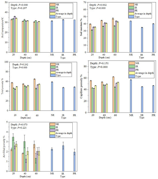 In Figure 3, the difference between TP and CP is notable in the revetment, but the AFP difference is insignificant. The largest in NR and the smallest in IR were the TP (59.15 ± 0.01%) and CP (56.89 ± 0.01%). And the difference in soil moisture in revetment is significant. The soil moisture was highest in NR (43.98 ± 0.15%) and lowest in IR (35.11 ± 0.41%). Additionally, the variation in soil temperature is large at soil depth but small at the revetment, as illustrated in Figure 3.