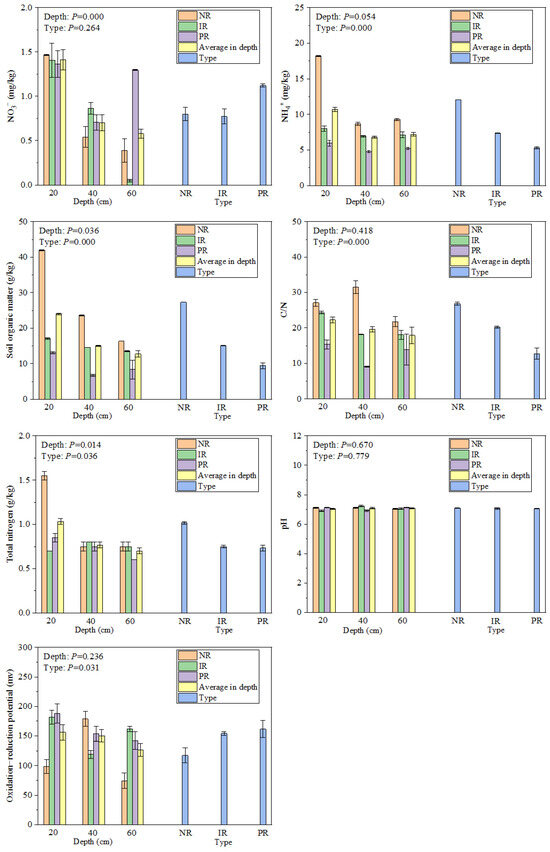 According to Figure 4, the changes in NH4+, C/N, ORP, SOM, and TN were considerable in the revetment. The highest concentration of NH4+ was found in NR (12.05 ± 0.03 mg/kg), which was 1.64 and 2.27 times greater than that of IR and PR, respectively. The C/N in NR (26.81 ± 0.45) was the highest and was 1.33 times and 2.10 times greater than in IR and PR, respectively. PR had the highest ORP (161.44 ± 14.44 mv), which was 1.38 and 1.05 times more than NR and IR, respectively. The SOM had the highest NR (27.28 ± 0.02 g/kg) and smallest PR (9.38 ± 0.87 g/kg) values with increasing soil depth. As soil depth increased, TN had the highest concentration of NR (1.02 ± 0.02 g/kg), which was 1.36 times greater than IR and 1.39 times greater than PR, respectively. The variation in NO3− is considerable in soil depth but not in a revetment. Additionally, neither at soil depth nor at revetment, the pH differential was appreciably different.