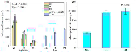 In revetment, the difference in AB is significant, as illustrated in Figure 5. The biggest AB (200.07 ± 18.30 g/m2) was found in PR, which was 2.49 and 1.05 times larger than that of NR and IR, respectively. The difference in UB is large at soil depth but not significant at revetment. As soil depth increased, UB dropped.