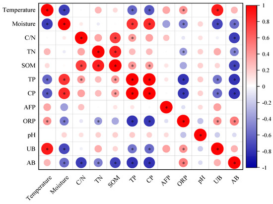 As shown in Figure 8, soil moisture is significantly negatively correlated with AB and UB. TN and SOM are significantly negatively correlated with AB and not significantly correlated with UB. Soil moisture is significantly positively correlated with TP and CP, while the correlation with SOM and soil porosity is not significant. TP, CP, and moisture are significantly negatively correlated with ORP, and UB is significantly positively correlated with ORP. The C/N ratio is significantly positively correlated with SOM and significantly negatively correlated with AB.