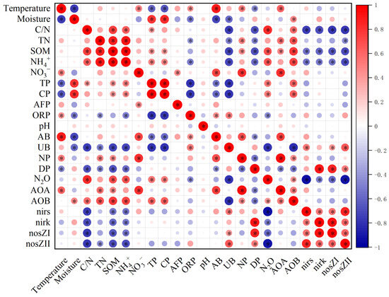 Correlation analysis of soil ecosystems and the abundance of nitrification and denitrification microbial genes, * indicates p ≤ 0.05.