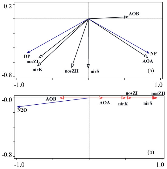 Redundancy analysis of nitrification potential, denitrification potential, and N2O emission rate, (a) is the RDA analysis of nitrification potential (NP) and denitrification potential (DP), and (b) is the RDA analysis of N2O emissions.
