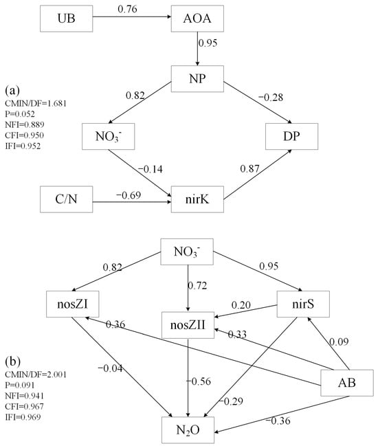 In the denitrification model (Figure 11a and Table 1) (CMIN/DF = 1.681, p = 0.052, NFI = 0.889, CFI = 0.950, IFI = 0.952; these indicators show that the quality of the model fitting data is good), the direct influence of nirK on DP is the highest; however, the indirect effect of C/N on DP is also significant. The C/N can affect DP by acting on nirK; UB and AOA can affect DP through NP. NirS, nosZI, and nosZII have a direct impact on N2O emissions according to the N2O emission model (Figure 11b and Table 1) (CMIN/DF = 2.001, p = 0.091, NFI = 0.941, CFI = 0.967, IFI = 0.969, these indicators show that the quality of the model fitting data is good). By altering nirS, nosZI, and nosZII, NO3− can have an impact on N2O emissions. Additionally, we discovered that nosZII can be impacted by nirS. The biggest effects are caused directly by nosZII and indirectly by NO3−.