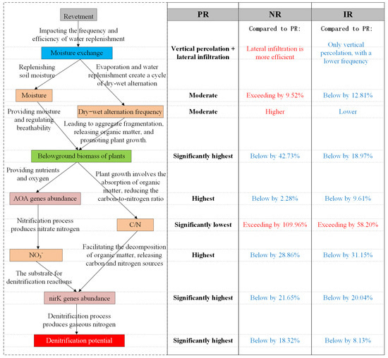 As shown in Figure 12, the moisture exchange frequency in PR is higher than in IR, and the organic matter released during dry–wet alternation is more abundant in PR. And the soil permeability in PR is better than NR [1]. These factors result in significantly higher belowground biomass of plants in PR compared to NR and IR, providing more nutrients and oxygen for AOA and promoting their growth [46,47,48]. This leads to a significantly higher gene abundance of AOA in PR compared to NR and IR (Figure 7). The NP in PR is significantly higher, providing more substrates (nitrate nitrogen) for the denitrification process. Meanwhile, the dry–wet alternation frequency in PR is higher than in IR, and the organic matter absorbed by PR plants is more than in NR. These factors result in a significantly lower carbon-to-nitrogen ratio in PR soil compared to NR and IR, promoting the decomposition of organic matter and the release of nitrogen. Under the combined influence of nitrate nitrogen and carbon-to-nitrogen ratio, the gene abundance of nirK in PR is significantly higher than in NR and IR, and the DP of PR is also higher than in NR and IR.