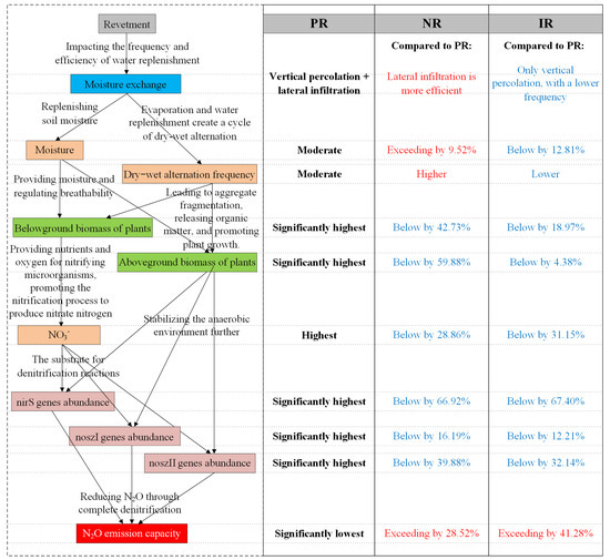 The research results indicate that the impact of revetments on NP in the RRI is not significant, but revetments can affect nitrogen removal and N2O emissions in the RRI by influencing DP. The soil moisture in PR is less than NR, and the moisture exchange frequency is greater than IR. This results in higher aboveground and belowground biomass in PR compared to NR and IR. Compared to NR and IR, in PR, plant roots decompose a greater amount of soil organic matter into simpler organic compounds by breaking down complex molecules such as polysaccharides, nucleic acids, and proteins in the soil organic matter, making these compounds more readily absorbed by the plants. A larger belowground biomass can provide nutrients and oxygen for AOA, promoting the nitrification process and providing more substrates (nitrate nitrogen) for denitrification. The lower C/N ratio accelerates the decomposition of organic matter in the soil and the release of nitrogen. These factors lead to a significantly higher abundance of the nirK gene in PR compared to NR and IR. Since nirK is the main influencing factor for denitrification potential in the RRI, the denitrification potential of PR is significantly higher than NR and IR. Additionally, a higher aboveground biomass can stabilize the anaerobic environment in the soil, increasing the gene abundances of nirS, noszI, and noszII. This results in a significantly lower N2O emission capacity in PR compared to NR and IR. These findings comprehensively describe the mechanisms by which revetments impact nitrogen removal and N2O emissions in the RRI, enable the development of riparian zones that combine nitrogen removal and greenhouse gas emission reduction, and offer more precise instructions for the design of urban revetments.