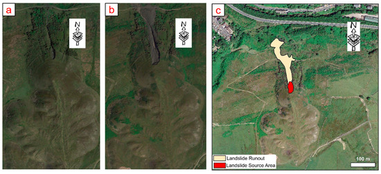 On 18 December 2020, a landslide event was identified as occurring in a previously established landslide scarp, as can be seen in the comparison between Figure 2a,b. The landslide was recognised as a shallow rotational slide in the slope face. Its extent was delineated on a Google satellite image, as shown in Figure 2c, highlighting its source area and runout from the south face of the tip. The runout travelled approximately 250 m along a pre-existing trench and spread out from the source area in a fan-like shape, consequently reaching the scrubland at the toe of the slope.