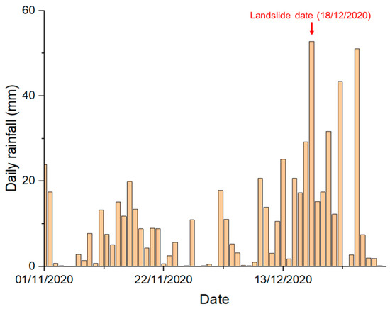 HadUK-Grid provides a daily rainfall data set consisting of 5 km × 5 km grids over the UK [39]. The rainfall data located at the study area indicate that the landslide happened after continuous rainfall which commenced from 9 December 2020 with 20.7 mm and achieved a maximum of 52.8 mm daily rainfall on the day of the landslide (Figure 3).