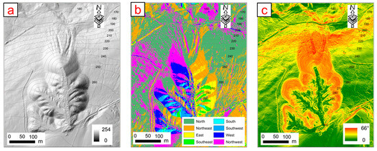 Minor failure scars and distinct water channels were observed on the north face prior to the 2020 landslide (Figure 2a). They are also highlighted by shadows on the hillshade map (Figure 4a) that was used to simulate the effects of the sun’s rays on the three-dimensional terrain surface. The hillshade map was created from a 1-m digital terrain model (DTM) (2011) which was acquired from an open-source database, DataMapWales [40]. The existence of water erosion gullies or channels implies poor surface water management and relatively weak or easily eroded material making up the colliery spoil. The north face of the tip was characterised by a 50 m high slope with inclination ranging roughly from 30° to 40°. Both flanks (east and west) were less inclined: approximately 30° in general, as seen in Figure 4b,c.