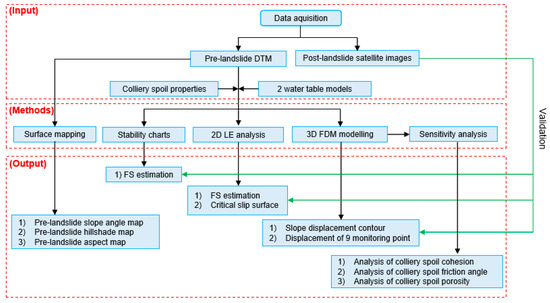 Methodology of this research, including the input part to collect data for landslide analysis, the methods part of different methods used for landslide analysis, the output part of the final results obtained using these methods, and the validation process using post-landslide satellite images.