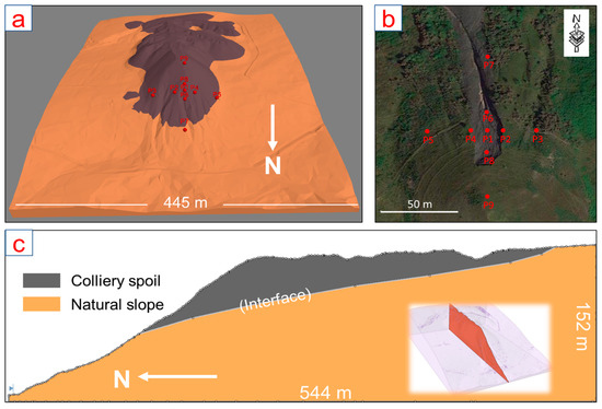 Prior to analysis, two slope models (2D and 3D) were created using the 2011 LiDAR DTM data to depict the pre-landslide tip geometry, as presented in Figure 6. The 3D model was developed through extrusion of the DTM to the base plane of 150 m above the ordnance datum (Figure 6a). Several points were placed on the surface of the model to monitor the surface slope displacement in FDM modelling (Figure 6b). The 2D model (cross section) was generated along an N–S profile that intersects the points P7–P6–P1–P8–P9 (Figure 6c).