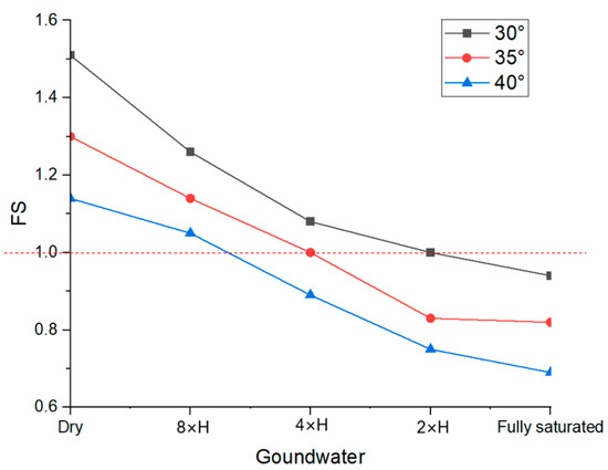 Figure 8 summarises the results of stability chart analysis associated with different groundwater conditions. The figure reveals that a slope with a lower inclination obtains a relatively high FS in an analogous groundwater condition. Furthermore, all the FS lines exhibit a declining trend with an increase in water table, which is a common phenomenon induced by additional pore water pressure. The FS undergoes a sudden reduction from the 8×H groundwater condition to the 2×H groundwater condition, ultimately approaching values that are less than 1.