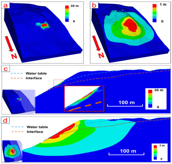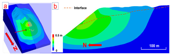 FDM modelling result showing the total displacement of a dry slope (regime_1). (a) overview of the modelling result, (b) an N–S cross section of the total displacement contour.