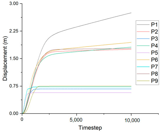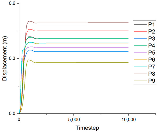 The modelled total displacement contour for a dry slope is presented in Figure 10. The slope achieves the maximum total displacement of approximately 0.5 m in the colliery spoil in the north face. An N–S cross section was taken through the central section of the model to inspect the total displacement in the model, and only minor total displacement was observed. In addition, the displacement curves in Figure 11 reveal that the nine points converge to constant values. These results indicate that the slope is stable under a dry condition.