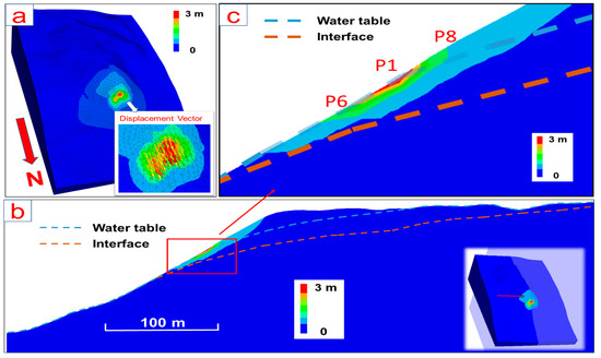 FDM modelling result of a partially saturated slope (regime_1). (a) Contour of slope displacement and modelled displacement vectors of the unstable zone, (b) an N–S cross section of the slope displacement contour, (c) close-up image of the N–S cross section showing the geometry of the unstable zone and monitoring points P1, P6, and P8 on the slope.