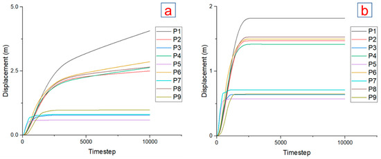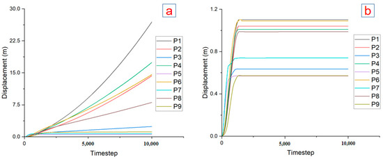 Figure 14 and Figure 15 show the results of sensitivity analysis associated with the variation in the cohesion of colliery spoil that ranges from a minimum of 0 to a maximum of 20 kPa. The total displacement curves of monitored points indicate that increased model displacement occurs when the tip is composed of cohesionless colliery material (Figure 14a) when compared to a slope material that has the mean cohesion value (Figure 13). In particular, P2 exhibits an exponential rise in displacement with the decrease in cohesion to 0. In addition, P3 becomes unstable, which is characterised by a continuous rise in displacement in Figure 14a. Once the cohesion increases to 20 kPa, the slope converts to a stable state in the modelling. The displacement curves of all monitored points achieve convergence, as seen in Figure 14b. In addition, no differential displacements are observed in the modelling following the initial equilibrium condition (Figure 15b,d).