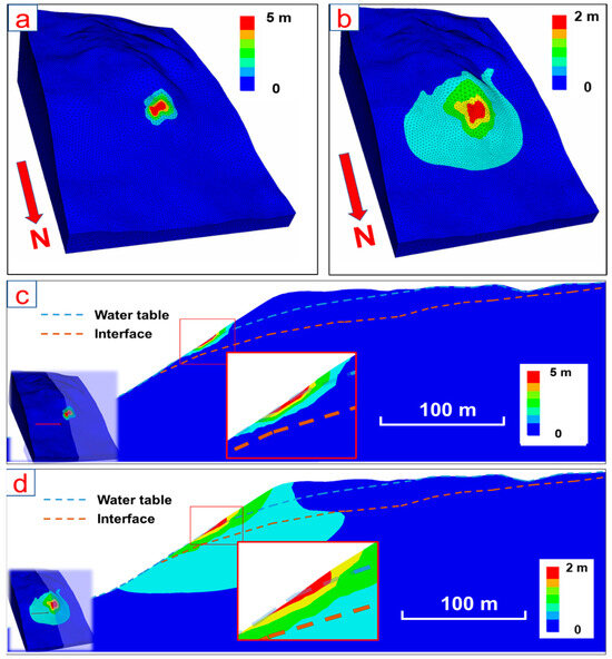 Results of sensitivity analysis associated with the cohesion of colliery spoil. (a) c = 0, (b) c = 20 kPa, (c) N–S cross section of the cohesionless modelling result, (d) N–S cross section of the 20 kPa modelling result.