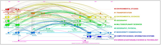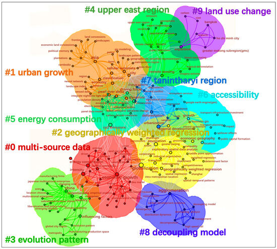 Subsequently, the popular research topics are identified through the use of a co-citation cluster. The keyword co-citation cluster network is presented in Figure 3 in the form of a landscape view. Each cluster comprises a group of words that are closely related to one another, thereby illustrating the degree of relationship between these words and the subject matter they form. Figure 3 lists the nine major co-citation clusters identified by CiteSpace, namely: 0# multi-source data, 1# urban growth, 2# geographically weighted regression, 3# evolution pattern, 4# upper east region, 5# energy consumption, 6# accessibility, 7# Tanintharyi, 8# decoupling mode, and 9# land use change. The smaller the number, the more keyword members are included in the cluster, which is more representative than a cluster with a larger number [24].
