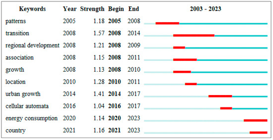 In traditional co-citation analysis, the focus is on homogeneous networks of co-cited papers. However, newly published articles are often underrepresented due to the fact that they may not have accumulated sufficient citations [16]. Burst-detection algorithms in CiteSpace are capable of identifying surging topical terms and detecting emerging trends and abrupt changes [16,17]. Figure 4 depicts the 10 keywords with the strongest citation bursts, with red lines representing time durations in which the size of bursts changed significantly, that is, sudden, rapid increases in citation counts. Blue denotes citation durations. The time intervals can be classified into four distinct stages. Previous studies by scholars in the initial stage concentrated on the keyword “patterns”. The second stage is concerned with “transition”, “regional development”, “association”, “growth”, and “location”. The third stage is distinguished by the emergence of urban growth and cellular automata. The fourth stage encompasses citation bursts of the keywords “country” and “energy consumption”. This is closely related to notable global concerns about energy consumption, the further deepening or disintegration of globalization, and China’s Belt and Road Initiative.