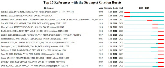 Figure 5. Top 15 references with the strongest citation bursts [5,25,26,27,28,29,30,31,32,33,34,35,36,37,38]. Source: Mapping scientometric analytic software CiteSpace. Note: The red color in the image indicates a significant citation burst.