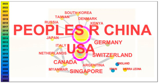 It is possible to ascertain the major countries and research institutions that have had a significant impact on the study field, as well as the cooperative relationships among them, by examining the network of cooperation between those nations and institutions [23]. As illustrated in Figure 6, China and the United States were the most prominent countries in the network. Although China has a larger node than the United States, the United States has a longer history and an earlier start to international cooperation. China has exhibited a more pronounced increase in its level of international cooperation over the past five years. The remaining countries have demonstrated a comparatively limited degree of cross-border cooperation, with each accounting for less than 10% of the total. In general, the extent of research cooperation between countries is relatively limited.
