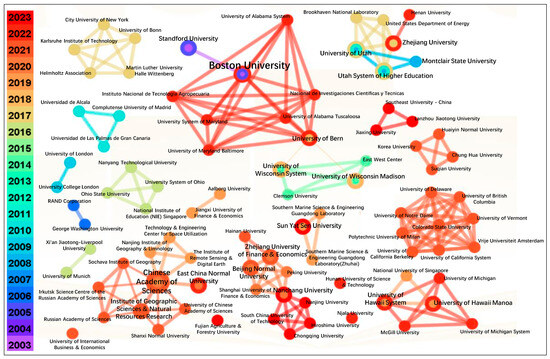 Figure 7 illustrates the institutional cooperation networks. The connecting line between the nodes represents the cooperative relationship between the institutions. The greater the width of the connecting line, the stronger the strength of cooperation. The colors of the nodes in the form of a chronology indicate the times of publications, while the color of the connecting line represents the time of the first collaboration. It is evident that the majority of collaborations occurred within the past five years.