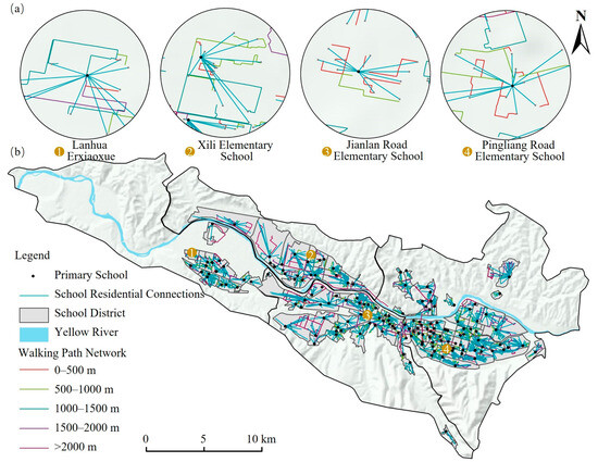 (a) Walking routes to and from school in surveyed elementary schools; (b) walking route network for elementary school students in the central urban area of Lanzhou city.