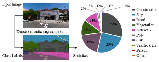 School-front spatial evaluation includes the street space within a 200 m radius of the school gate and the elements of the school-front space. The quality assessment of the school-front space utilizes a method combining street view images (SVIs) and image recognition technology [35]. The cityscape dataset is utilized to annotate street view image results, with Dense Semantic Segmentation dividing street view images into 30 categories [36]. Elements in the street view, such as flat surfaces, humans, vehicles, and constructions, are identified, and the proportion of specified elements to total image elements is calculated (Figure 3).
