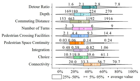 The results of road comfort show that the average path distance in the path network is 870 m, 86.23% of the paths are less than 1500 m, and 69.40% of the paths are less than 1000 m, which indicates that most students can reach school on foot in 15 min, which is basically in line with the principle of the layout of the 15-min living circle. However, more than 7.21% of the paths have a length of more than 2000 m, which is a significant barrier for this group of students to walk to and from school. Comparing the straight-line distance between home and school, the average straight-line distance is 575 m, which exceeds the requirement of a 500 m service radius of the elementary school, and the average detour ratio is 2.5, which is larger, reflecting that the road network structure is not perfect and the penetration of the road to the area, as well as the neighborhood scale division, is still insufficient. In addition to the influence of the Lanzhou belt topography, paths with longer straight-line distance addresses are often located on the east and west sides of the school, and according to Chang-Deok Kang’s research results, a 500 m distance of the walking path network circular structure is better, while more than 1000 m after higher circular flatness is more unfavorable to pedestrian travel [42].