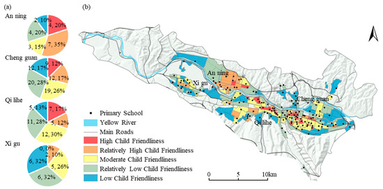 (a) Number and percentage of different levels of friendliness in the four administrative districts; (b) Spatial distribution of different levels of friendliness.