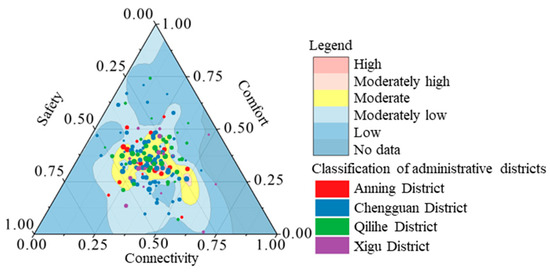 The ternary plot illustrates the classification tendencies of each primary school across three system layers, as depicted in Figure 7. High friendliness scores predominantly cluster around the centroid of the triangle, indicating that school districts with high friendliness exhibit favorable performance across the dimensions of accessibility, safety, and comfort. These indicators primarily range between 0.25 and 0.75, 0.25 and 0.625, and 0.375 and 0.75, with higher friendliness tending towards regions emphasizing greater comfort. Conversely, low friendliness is concentrated at the triangle’s vertices, reflecting that a particularly low score in any of these dimensions prevents overall improvement in friendliness, underscoring the need for integrated planning considerations. Furthermore, no data fall in the region where comfort scores are below 0.125 and safety scores are below 0.5, underscoring the minimal requirements that friendliness ratings have for safety and comfort.
