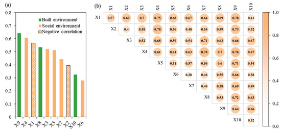 The results using the Geodetector model are shown in Figure 8. Population density and transportation convenience have a significant positive impact (>0.6) on child friendliness. The population directly influences the provision of primary schools, as according to the “Standards for Urban Residential Area Planning and Design”, residential areas with populations of 15,000–25,000 must be equipped with primary schools. The greater the number and more evenly distributed the primary schools are, the more they can significantly reduce students’ commuting distances. The “time–space compression” benefits brought by transportation convenience directly shorten the length of the commuting path, and areas with strong transportation convenience can bring better effects in terms of both accessibility and comfort on the commuting path.