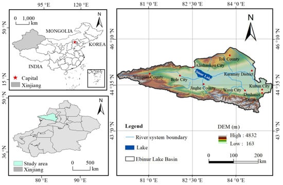 Map of the location of the Ebinur Lake Basin in the northwestern border area of Xinjiang, China. Clockwise from the top left: Map of China showing the location of the Xinjiang Uygur Autonomous Region; map of the study region within Xinjiang; and map of the study area (Vector data sources: Geospatial Data Cloud, https://www.gscloud.cn, accessed on 15 June 2024).