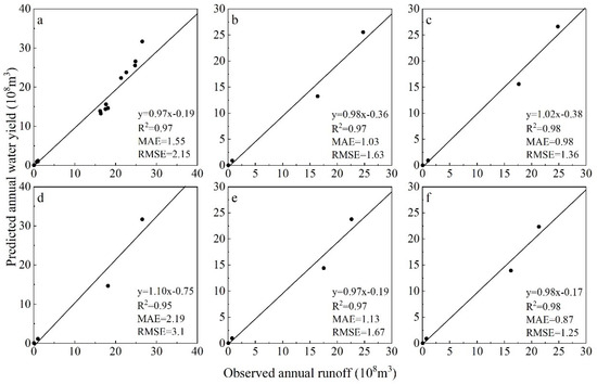 Fitting of the observed and simulated values. (a) Simulation performance of the model in all periods. (b) Simulation performance in 2000. (c) Simulation performance in 2005. (d) Simulation performance in 2010. (e) Simulation performance in 2015. (f) Simulation performance in 2020.