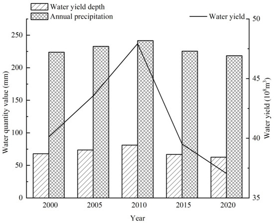 From 2000 to 2020, the water yield depth in the Ebinur Lake Basin ranged from 62.68 mm to 81.09 mm. The water production depths in 2000, 2005, 2010, 2015, and 2020 were 67.86 mm, 73.68 mm, 81.09 mm, 66.86 mm, and 62.68 mm, respectively. During this period, the depth of water production showed an inverted ‘V-type’ law of rising first and then falling (Figure 3). The annual water production in the Ebinur Lake Basin was ranked as follows: 2010 (4.793 billion m3) > 2005 (4.355 billion m3) > 2000 (4.011 billion m3) > 2015 (3.952 billion m3) > 2020 (3.705 billion m3). As can be observed in Figure 3 above, the overall water production had a clear trend of change, with the general tendency of growth followed by a decline, and with the highest value occurring in 2010 and the lowest in 2020. From 2000 to 2010, the amount of water production increased by 782 million m3, with an average annual change rate of about 1.95%. Between 2010 and 2020, water production saw a reduction of 1.088 billion m3, and the average annual change rate during this period was 2.27%. Overall, the water production in the region decreased.