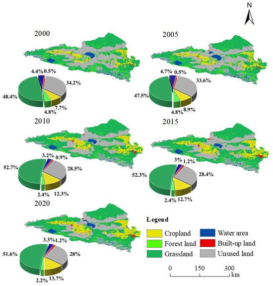 Figure 5 illustrates the distribution of various land categories within the Ebinur Lake Basin during 2000–2020. The findings indicate that the primary land categories within the study basin consisted predominantly of unused land and grassy terrain, collectively occupying over 80% of the river basin’s total area on an annual average basis. However, the coverage area of other land types was small, and the area of cultivated land, water area, and area of forest land accounted for about 11.06%, 3.72%, and 3.32%, respectivley. The smallest area was that of construction land, accounting for only about 0.86%. Compared with 2000, the area of cropland, built-up land, and grassland increased by 6.59%, 78.53%, and 148.64%, respectively, in 2020. The forested areas experienced a reduction of 53.63%, while water bodies saw a decline of 23.53%, and unused land decreased by 18.04%. In general, the categories of land use underwent a significant transformation.