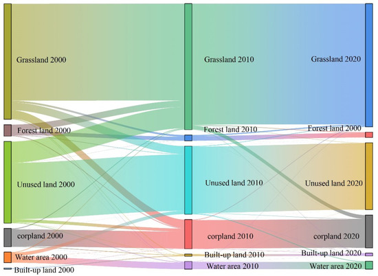The land use transfer matrix (Table 5) and the land use Sangji map (Figure 6) visually illustrate the alterations in the transfer status of various land use types over the course of the investigation period. Table 4 specifically reflects the extent of transformation in land utilization from 2000 to 2020. The main transformation directions of cropland were grassland and construction land, with transfer areas of 161.17 km2 and 175.38 km2, accounting for 43.94% and 47.81% of the total land conversion area. The land type into which forest land was converted was mainly grassland; furthermore, the land type into which grassland was converted was mainly cultivated land, and the transfer area was 2544 km2, accounting for 49.98% of the transfer area. In addition, there were also water areas that were converted into unused land, which may have been due to the reduction in the extent of snow and ice in the mountainous zones of the area. The built-up land was predominantly transformed into cropland, covering 56.88 km2. The unused plots were chiefly repurposed into grasslands, covering 5008.74 km2, which represented 76.84% of the overall transfer area of unused land. Among the six types of land use, cropland saw the most significant increase in area, while the unused land experienced the largest decrease, reflecting impacts from human development and construction efforts.