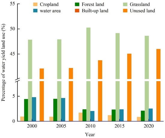 Ratio of water yield generated by each land use type to overall water yield between the years 2000 and 2020.