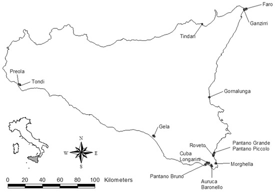 The coastal wetlands of Sicily (Italy) belong to a migration route, namely the central–eastern Mediterranean bird flyway, of high importance for many avian species crossing the Mediterranean Sea. Because these wetlands serve as refueling areas for hundreds of thousands of waterbirds migrating between Africa and Europe every year [13,14], they are ranked among the most important natural sites at the European level [15]. In summer, these wetlands host many waterbird species, whose conservation interest is mainly at the European and global levels as almost 90% are migratory [9]. The summer period is also a bottleneck time for these waterbirds due to higher levels of tourism activities and human use (illegal dumpsites, camping sites, and so forth) and the concomitant decrease in water levels imputable to water diversions, evaporation, and low rainfall [16,17]. In fact, the coastal wetlands of Sicily are seriously impacted by human activities and climate warming. During 1990–2012, an increase in agricultural and artificial areas, and concomitant decrease in natural and semi-natural ones, occurred in the close surroundings of these wetlands, which caused severe threats like water diversion and discharges due to agricultural activities, the human use and degradation of the surroundings, and tourism pressure [18]. In addition, the increased evaporation has already boosted the frequency of complete wetland drainage in summer, and accelerated sea level rises are already causing frequent saltwater intrusions [9,17].