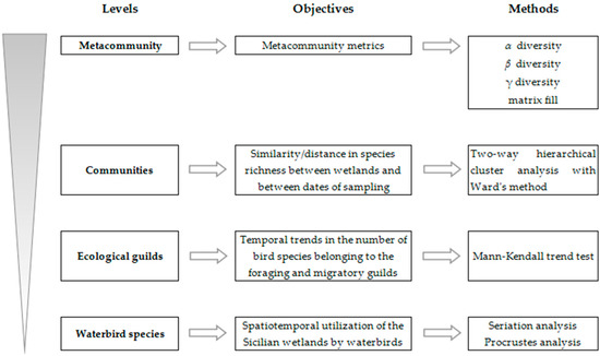 Accordingly, in this study, we used a multilevel analytical approach, involving the metacommunity, community, guild, and species levels, to detect the spatiotemporal dynamics in bird species assembly in these wetlands during the critical summer period. We found clear and sharp patterns in bird species assemblages at all the biodiversity levels investigated. Our study determined the wetlands and waterbird species to which the priority for conservation should be assigned, as well as the exact time span during the summer period when conservation measures should be mandatory, and not only advisable. Because human activities and climate change could induce fast changes to wetland traits, our results also suggest updating biodiversity data on a regular basis.