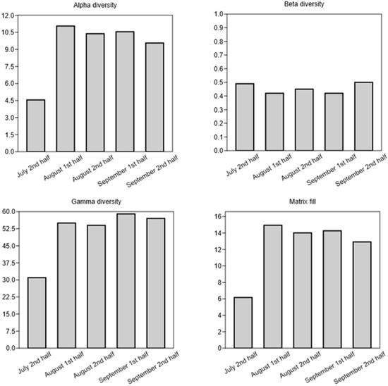 With the exception of β diversity, all the metacommunity metrics were low in the second half of July (J2) and approximately doubled in the successive sampling sessions (A1, A2, S1, and S2), where they showed little if any change (Figure 3).