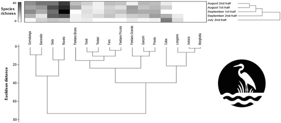 At the species level, we found a statistically significant (C = 0.94; Z = −5.06; p < 0.01) temporal sequence of the occurrence of waterbird species in the Sicilian wetlands during July–September (Figure 5). Two species (Great Egret and Black-tailed Godwit; group 1) were only early dwellers (J2 and A1). By contrast, ten species (groups 14, 15, and 16) were only late dwellers (S1 and S2). Twenty-six species made use of the Sicilian wetlands all summer long (group 2). Seven species were present intermittently from A1 to S2 (group 8), while a further 13 species were constantly present in the same period (group 9).