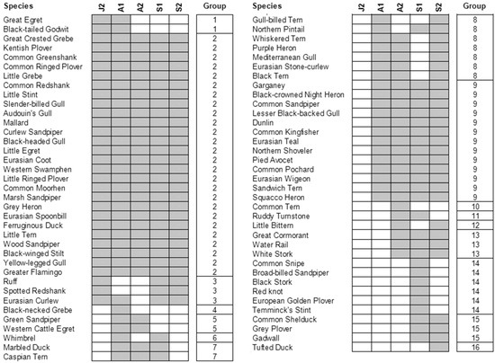 Results of the seriation analysis. The waterbird species are arranged into a statistically significant temporal sequence from early dwellers (group 1) to late dwellers (group 16). J2: second half of July. A1 and A2: first and second half of August. S1 and S2: first and second half of September.