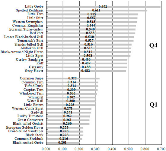 Results of the procrustes analysis. The numbers represent the sum of the residual vectors (SL). Waterbird species are arranged downward from those exhibiting the highest site infidelity (i.e., lowest site fidelity) to those with the lowest one (i.e., highest site fidelity). Only the fourth (Q4; species with highest site infidelity) and first (Q1; species with highest site fidelity) quartiles are shown. The full list of species is given in Table S11.