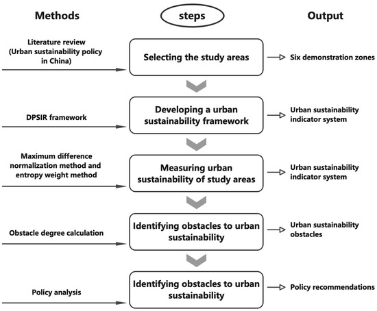 The research process of urban sustainable development is mainly embodied in measuring sustainability levels, identifying developmental obstacle factors, and proposing strategies to solve problems and break obstacles. As shown in Figure 1, we collected developmental data from six different cities in China, established a DPSIR framework for the six cities, and utilized the entropy weight method to measure the urban sustainability of the six cities with various developmental themes. Furthermore, we identified the obstacle factors in the process of pursuing the urban sustainability of the six cities under the DPSIR framework. After discussing the possible causes of the obstacles, we finally propose practicable recommendations for policymakers, urban administrators, and the public. On the basis of China’s practices, this study aims to enrich and expand the assessment of the level of sustainable development of cities and to compensate for the shortcomings of the current research.
